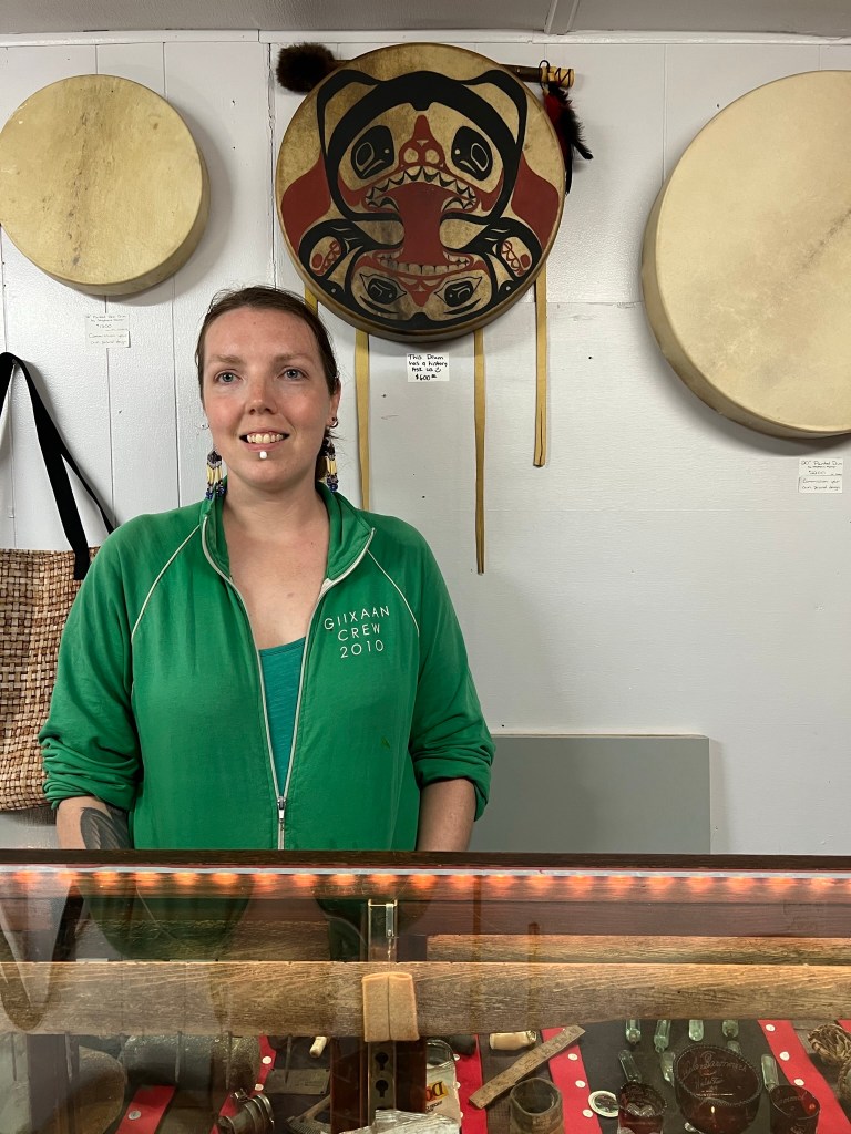 Top photo: Haida oceangoing red cedar dugout canoes. Photo courtesy Bonnie Hamar. Center left: Stephanie Hamar in the family museum. Middle: Bow captain at watch in the canoe. Photo courtesy Stephanie Hamar. Right: Kasaan, Alaska totem pole. Lead carvers: Stormy Hamar and Harley Bell-Holter. Apprentice carvers: Eric Hamar, Rebecca Sheufelt, Justin Hendrix and Andrew Kashevarof.Canoe crew ready to travel. Photo courtesy Bonnie Hamar.